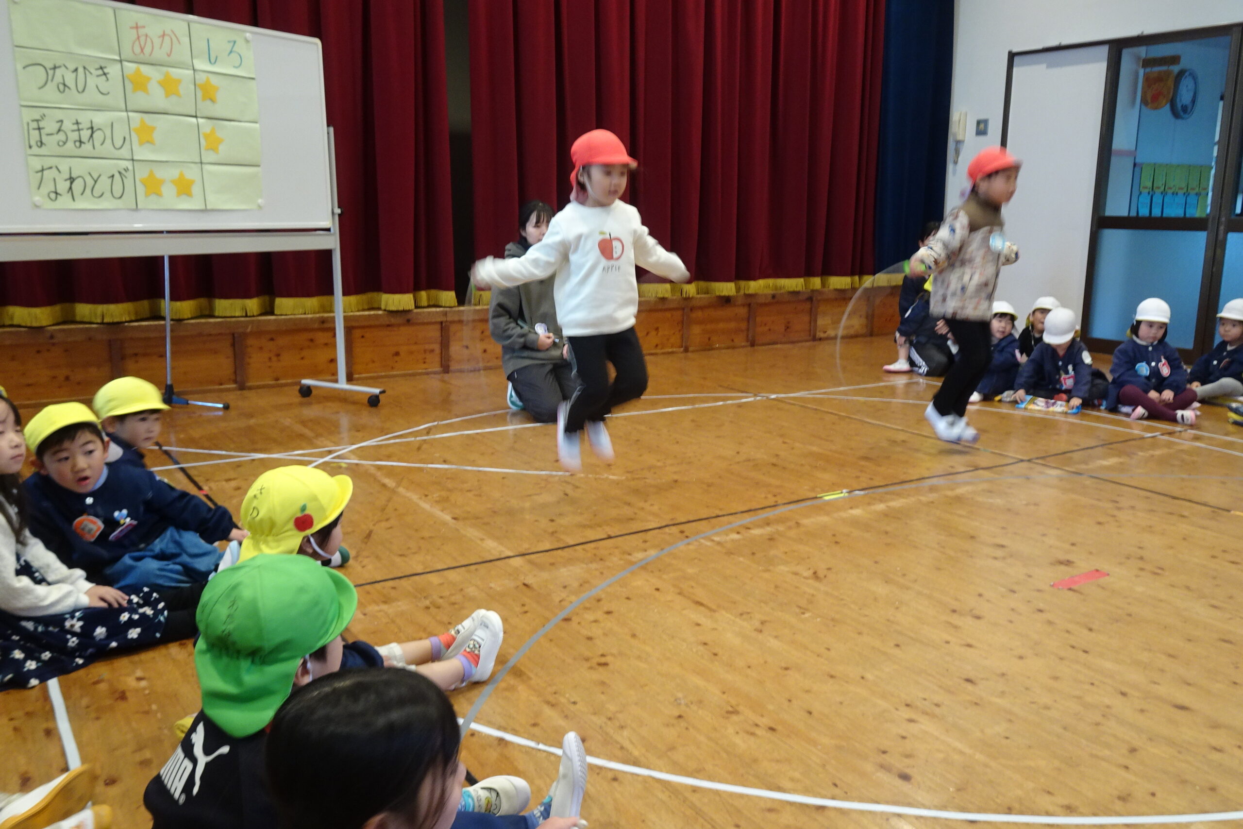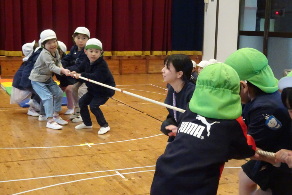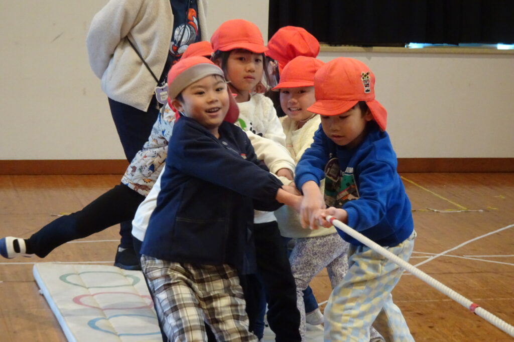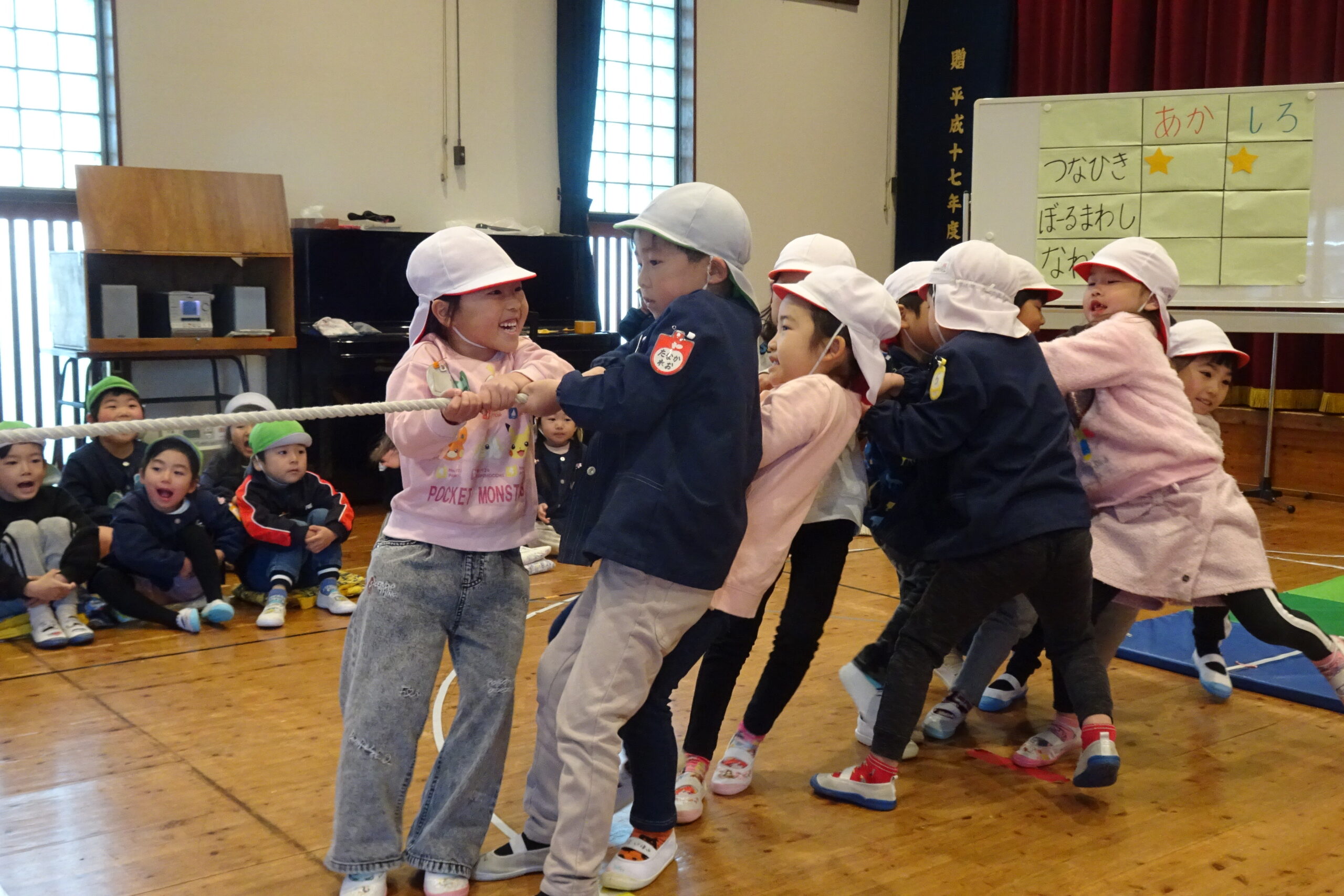 1月22日(木)です。本日、1月の誕生会を開きました。今回は、赤組と白組に分かれて、綱引き、ボール回し、縄跳びの対抗戦を行いました。みんな元気に頑張ることができました。