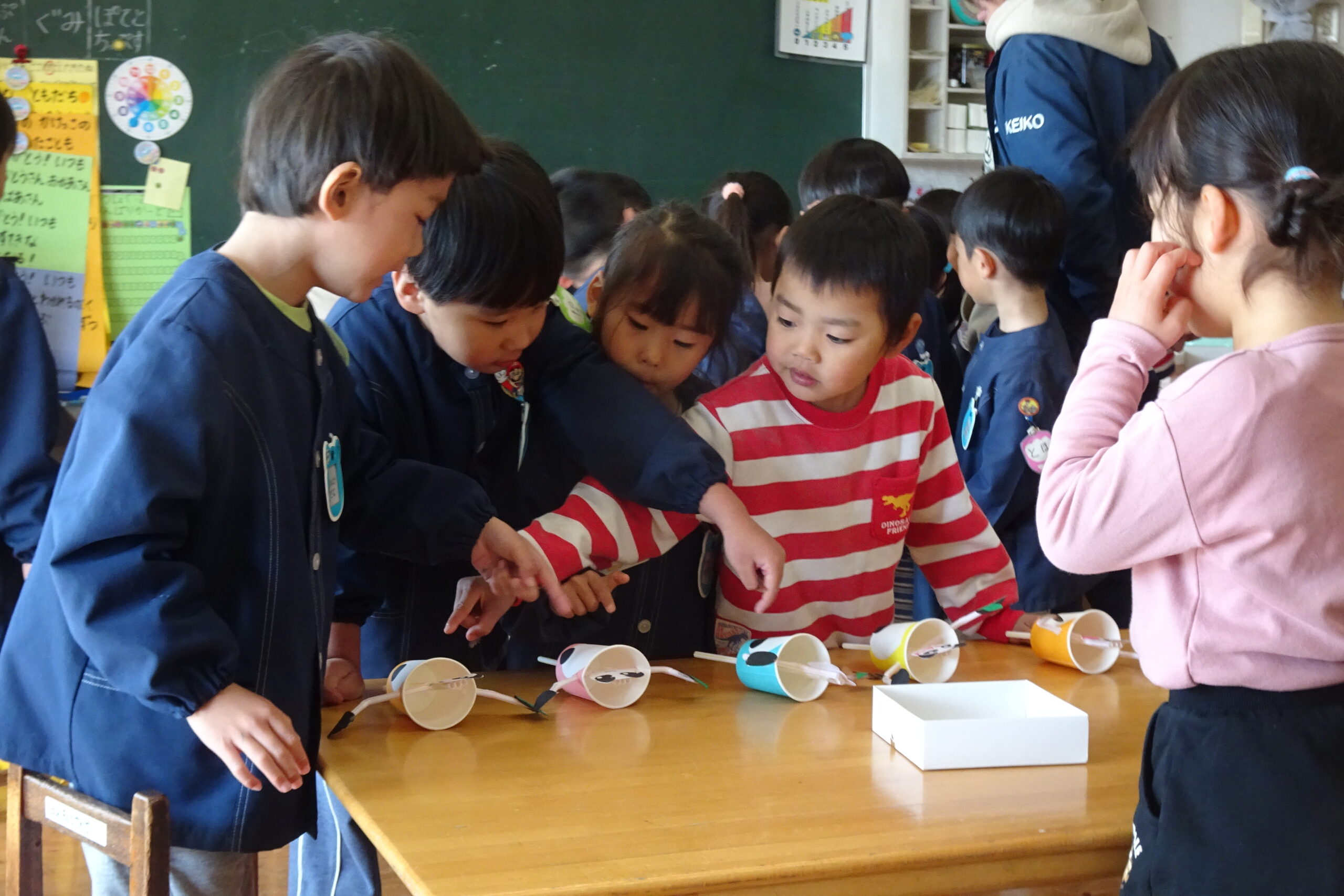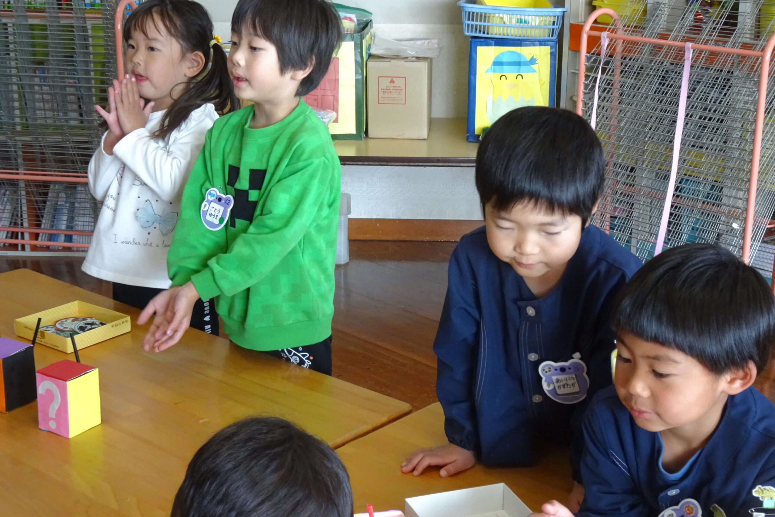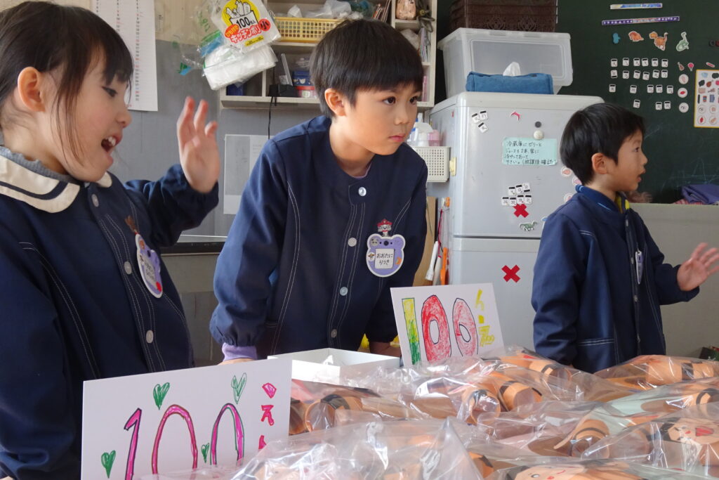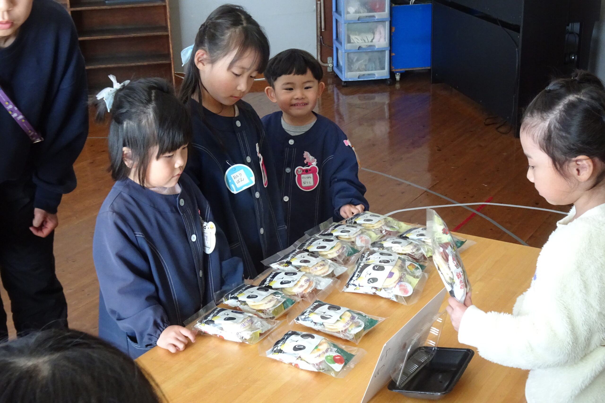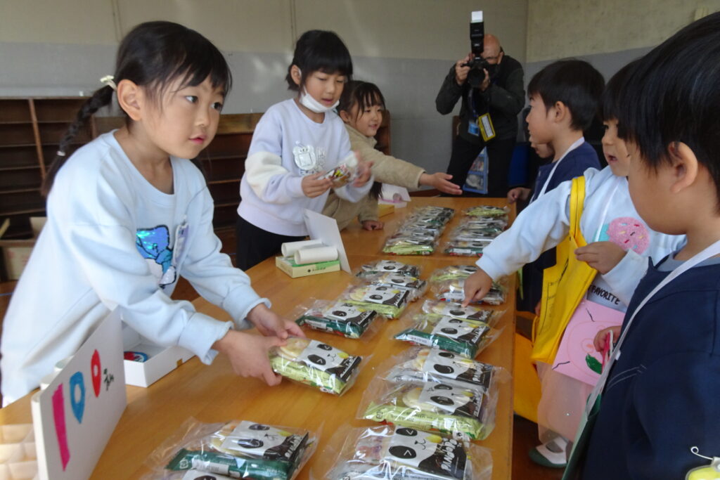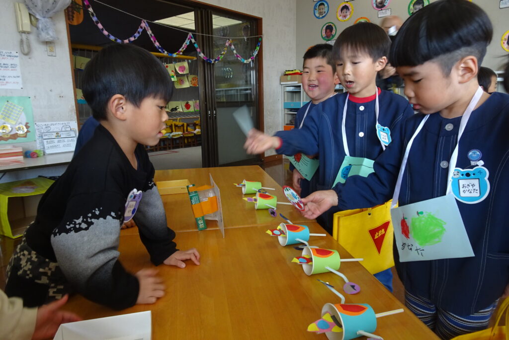 2月6日(金)です。本日は、お店屋さんごっこをして楽しみました。お菓子や製作の時間に作ったおもちゃを並べ、年長の子どもたちが店員となって販売しました。小さい子たちも手作りのお金を持って、4つのお店で買い物をして回りました。