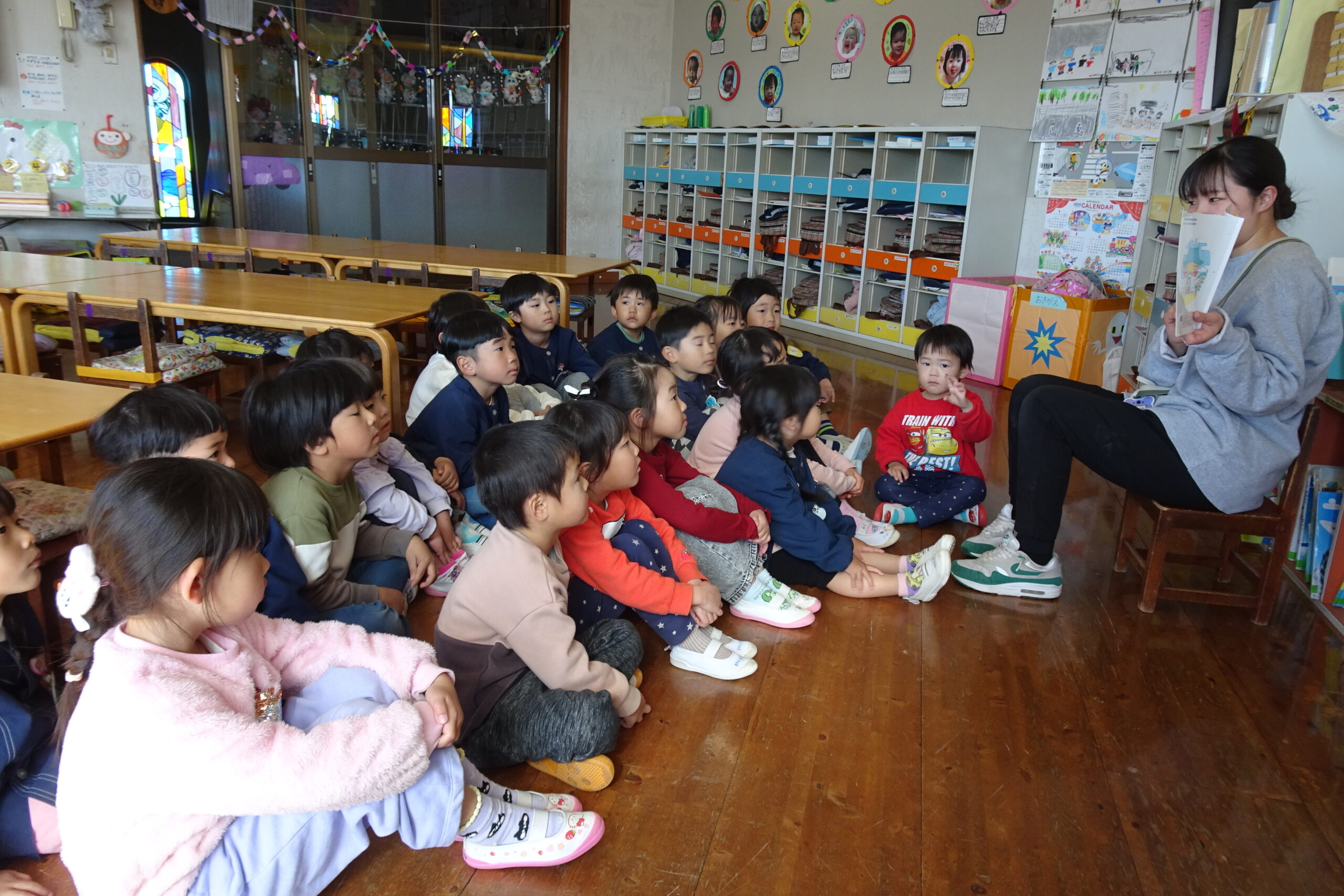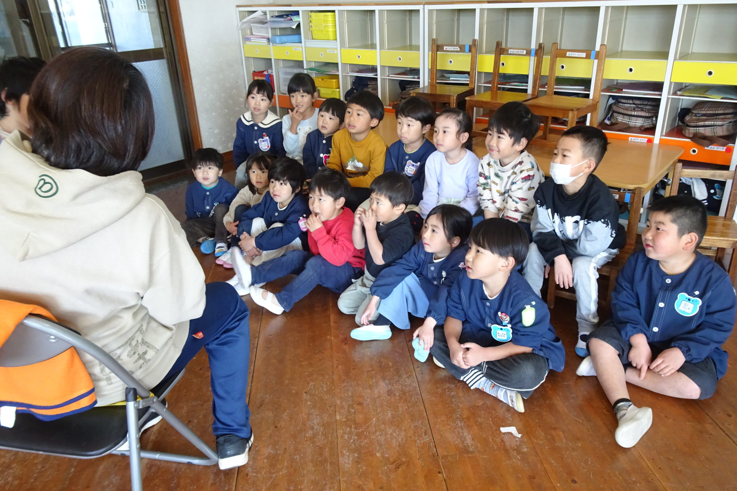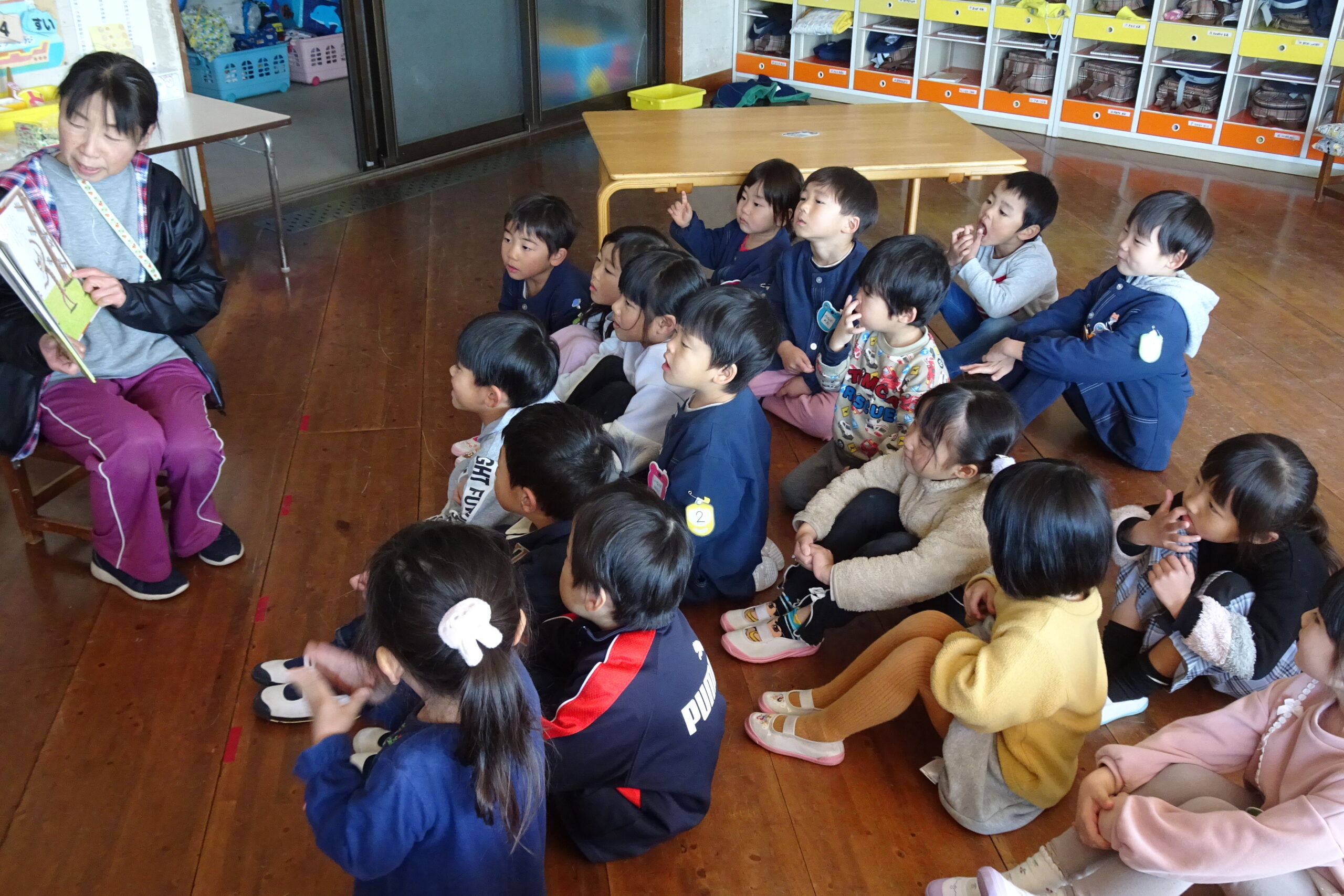 2月4日(水)です。今日はお始まりの後、動物グループに分かれて絵本の読み聞かせをしました。