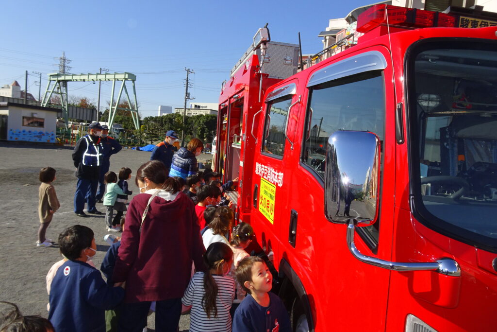 火災避難訓練が行われました。沼津北消防署原分署の方々の御指導、御協力をいただきました。最後に、消防車を間近に見ることができました。